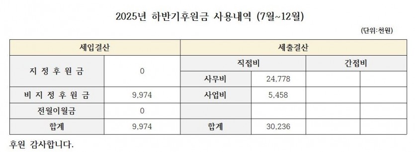 2025년 하반기 후원금 사용내역 페이지 정보 작성자 소망의문 댓글 0건 조회 57회 작성일 26-01-22 10:26 본문 후원감사합니다. 목록 답변 이전글법인 이사회 결과보고(결산공지포함) 26.02.03 다음글26년장기요양수가안내 26.01.14 댓글목록 댓글목록 등록된 댓글이 없습니다.